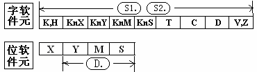比較源S1與源S2的大小,目標(biāo)地址D輸出相應(yīng)的動作。大小比較是按代數(shù)形式進(jìn)行的(-10<2)。所有源數(shù)據(jù)都被看成二進(jìn)制值處理。目標(biāo)地址D假如指定M0,則M1、M2被自動占用。
