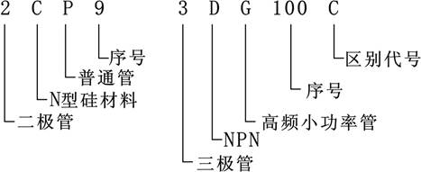半導體器件的型號由五部分組成:第一部分用數(shù)字表示半導體管的電極數(shù);第二部分用拉丁字母表示半導體管的材料和極性;第三部分用拉丁字母表示半導體管的類別;第四部分用拉丁字母表示序號,第五部分用拉丁字母表示區(qū)別代號。半導體器件型號前三部分的含義見表7,半導體器件型號識別示例如圖2-2-9所示。