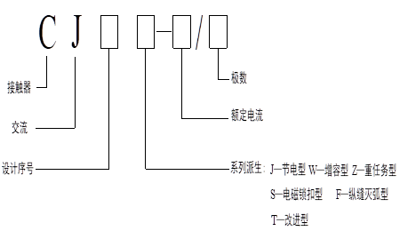 交流接觸器是一種用來頻繁地接通或是分斷交、直流主回路及大容量控制電路的自動切換電器,是電力拖動系統中使用最廣泛的電器元件。根據被控電路電源種類不同,可非為交流接觸器和直流接觸器兩類。其表示符號和型號含義如圖3-1-2所示