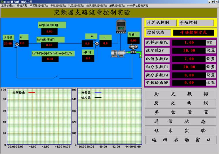 6.點擊“確認”,用戶登錄完畢。選擇“單回路控制實驗”下拉菜單中的“變頻器支路流量控制實驗”,出現(xiàn)如下的“變頻器支路流量控制實驗”界面。