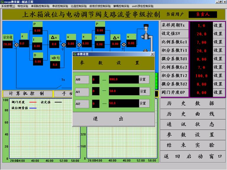6.點擊“確認”,用戶登錄完畢。選擇“串級控制實驗”下拉菜單中的“上水箱液位與電動閥支路流量串級控制實驗”,出現(xiàn)如下的“上水箱液位與電動閥支路流量串級控制實驗”界面。