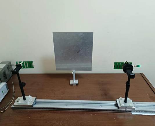 3、 移動(dòng)反射板,如圖所示,將接收八木天線安裝到支架上對(duì)準(zhǔn)反射波來波方向,注意與反射電場(chǎng)極化匹配。