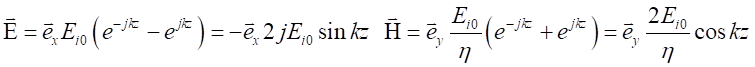 由上式可以看到,z≤0空間中的合成波具有如下特點(diǎn)電場(chǎng)強(qiáng)度和磁場(chǎng)強(qiáng)度的振幅不再是常量,沿波的傳播方向按正弦函數(shù)或余弦函數(shù)分布,即在kz=-np,也就