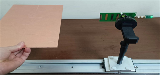 4)將水平水平縫隙柵格平面放入收發(fā)天線中間,觀察LED燈是否被點(diǎn)亮。