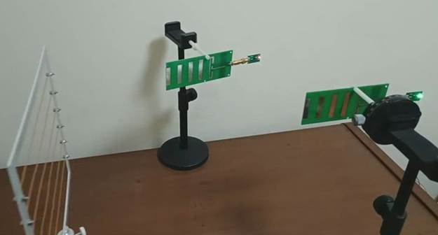 2)將八木天線安裝到旋轉(zhuǎn)支架上,將其垂直放置,移動到距離發(fā)射天線80~90cm處。移動反射板,如圖所示,將接收八木天線安裝到支架上對準(zhǔn)來波方向,注意與反射電場極化匹配。