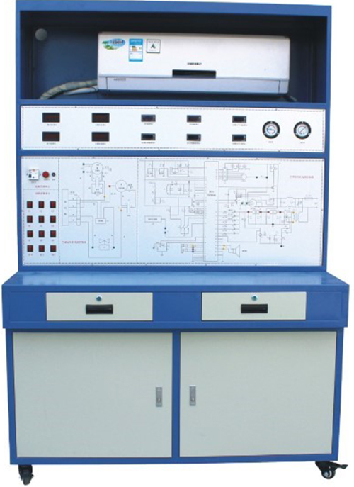 2. 裝置直觀展示了變頻空調(diào)的系統(tǒng)結(jié)構(gòu)和工作原理,便于教學(xué)演示講解及學(xué)生對課本知識的理解掌握。配置的交流電壓表、交流電流表、溫度表、真空壓力表以及相應(yīng)的信號指示燈,使整個變頻空調(diào)系統(tǒng)的實時工作狀態(tài)一目了然;主面板中間印有電氣控制系統(tǒng)原理圖,并設(shè)有相應(yīng)測試點;屏背面可觀察到整個制冷系統(tǒng)結(jié)構(gòu)原理以及主要部件的實際物體,相應(yīng)部件均有名稱標(biāo)識;并設(shè)有視液鏡,可觀察制冷劑狀態(tài)。