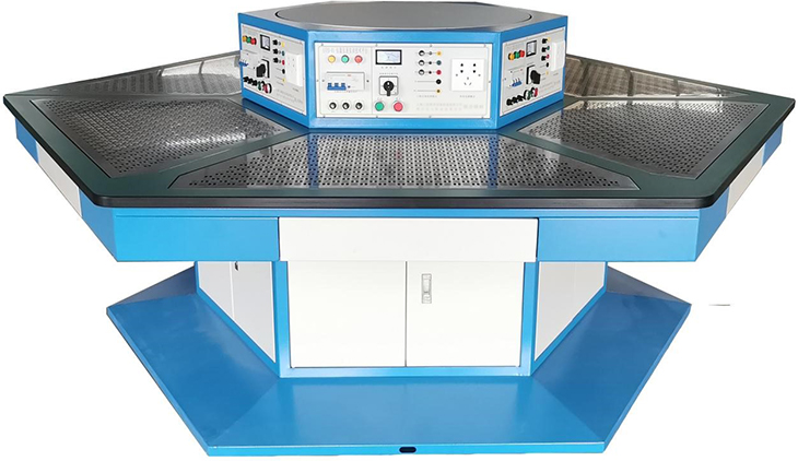 (二)六邊形電源控制屏:電源控制屏采用六邊形結(jié)構,與工作臺相對應。框架采用優(yōu)質(zhì)鞍鋼盒裝鋼板,經(jīng)過機械加工成型,外表面噴涂彩色環(huán)氧聚塑。六個作業(yè)面配置有實訓電源控制系統(tǒng),控制面板具有漏電保護、短路保護功能。電源控制屏頂面采用10mm厚的鋁框包邊,內(nèi)置有直徑為850mm的多角度公共操作平臺。每工位電源控制屏功能: