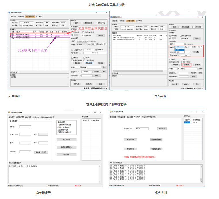 單卡及多卡EPC識(shí)別:?jiǎn)尾阶R(shí)別、單標(biāo)簽循環(huán)識(shí)別、防碰撞識(shí)別; 單卡及多卡TID識(shí)別實(shí)驗(yàn):標(biāo)簽識(shí)別號(hào); 標(biāo)簽UII塊區(qū)讀寫操作:指定UII讀寫、不指定UII讀寫、多字節(jié)寫 GEN2標(biāo)簽的USER多字節(jié)數(shù)據(jù)讀寫 GEN2標(biāo)簽的安全操作 GEN2標(biāo)簽的鎖定操作 |
