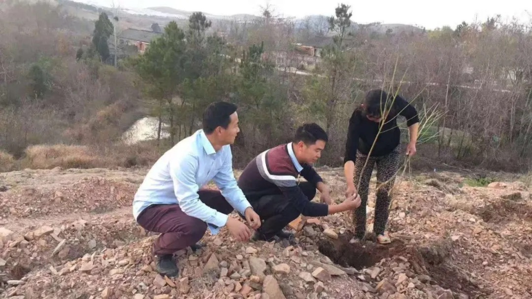 周軍委(左一)與貧困戶種植黃桃樹苗