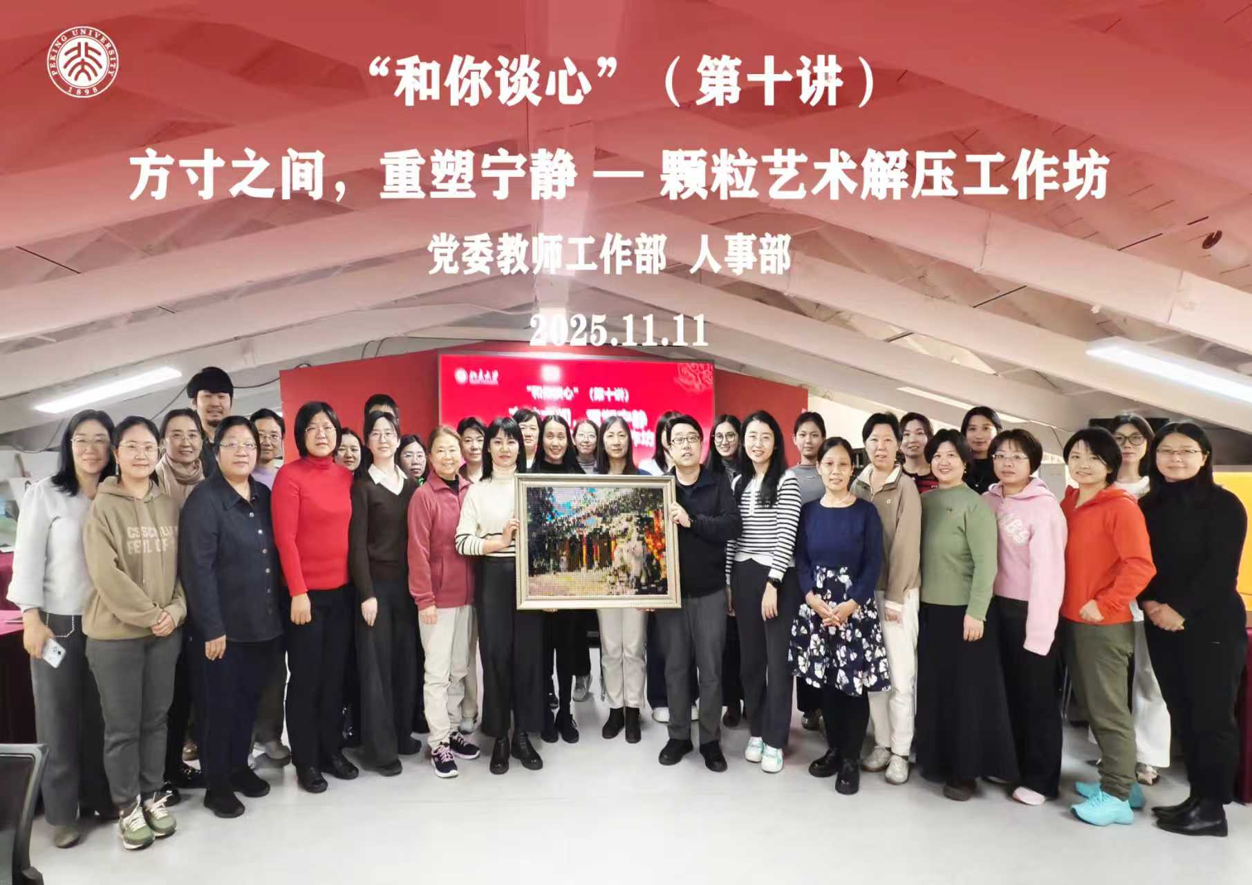 為進一步幫助教職工疏解壓力、調節(jié)情緒,以更加飽滿的狀態(tài)投入工作與生活,黨委教師工作部、人事部于2025年11月11日舉辦“和你談心”系列活動第十期——“顆粒藝術解壓工作坊”,40余位教職工參加。