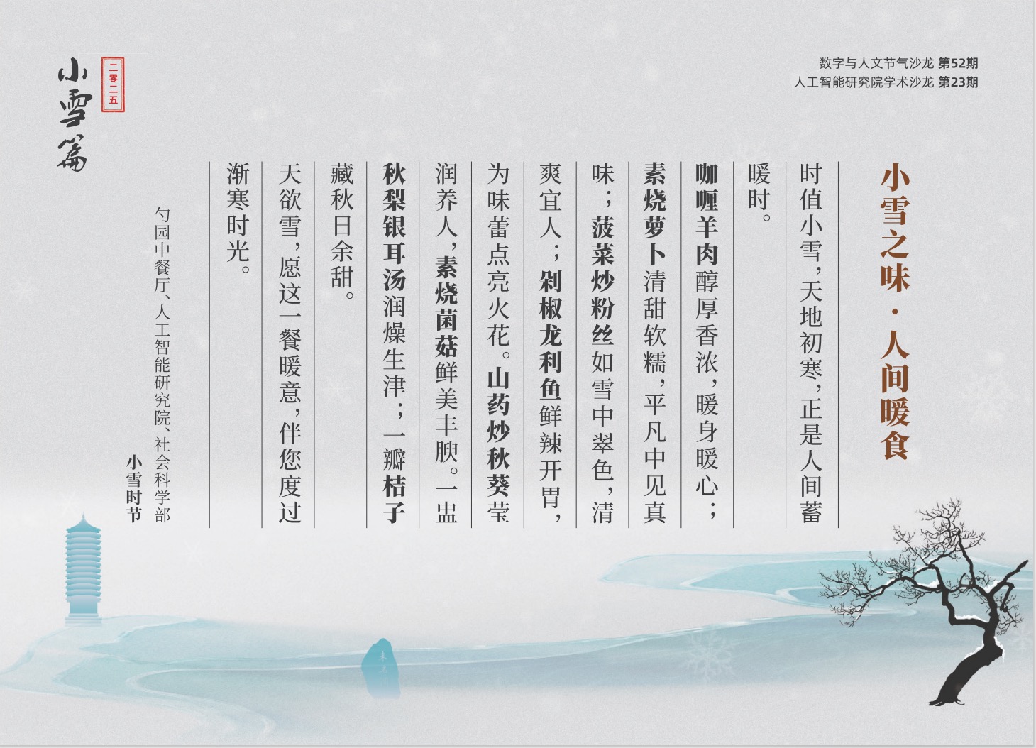 本次活動中,社會科學(xué)部繼續(xù)與勺園中餐廳合作,推出小雪節(jié)氣特色美食,為與會師生提供了良好的交流環(huán)境。玻爾知識庫繼續(xù)為沙龍活動提供專屬知識庫,方便不同專業(yè)背景的觀眾了解主題內(nèi)容。