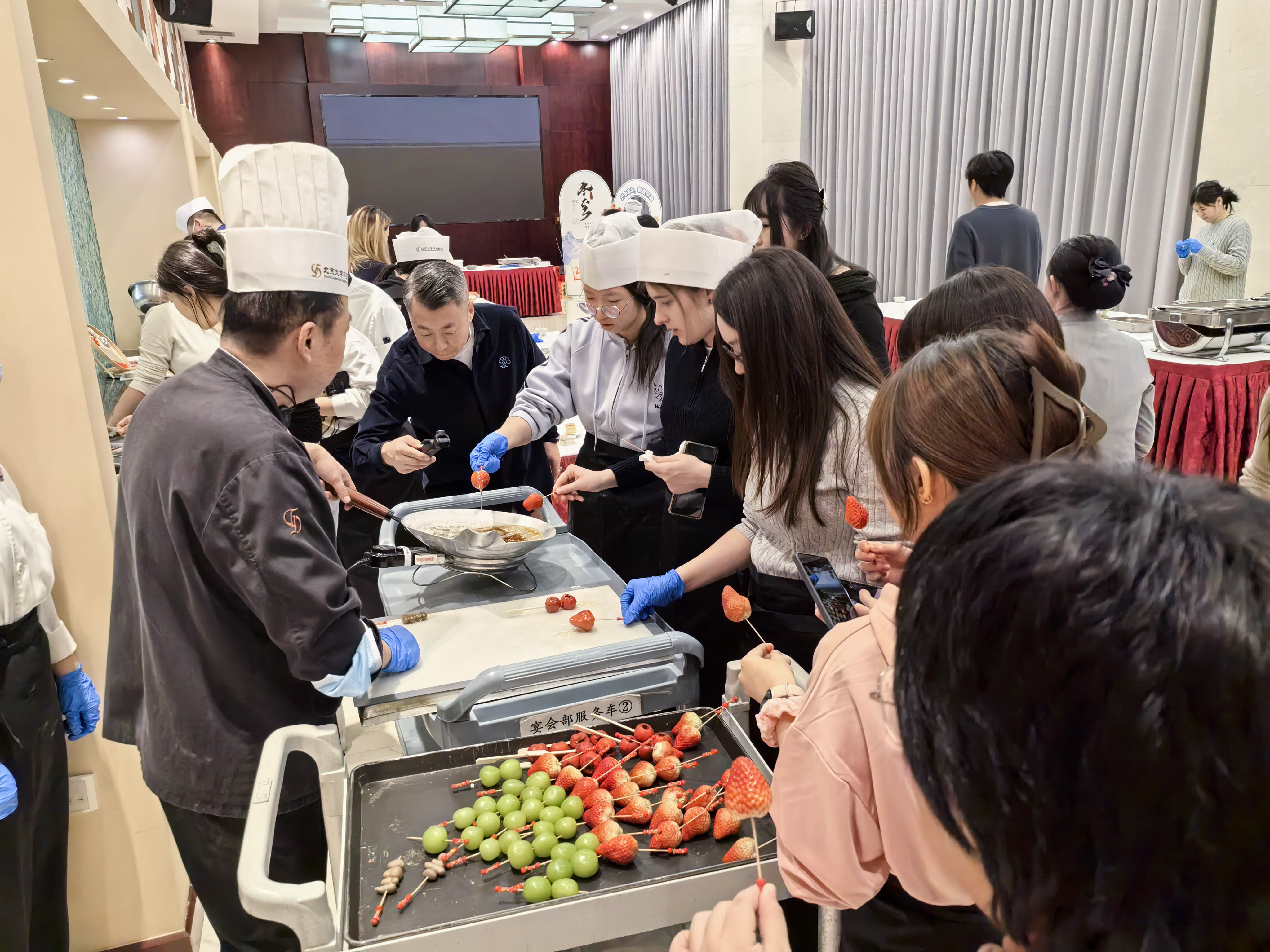在等待餃子煮制的間隙,冰糖葫蘆制作環(huán)節(jié)趣味登場(chǎng)。工作人員早已備好洗凈的山楂、各式鮮果與清亮的糖漿,現(xiàn)場(chǎng)指導(dǎo)同學(xué)們巧妙串果、均勻掛糖。隨著糖漿遇冷凝結(jié),裹上一層晶瑩透亮的“琉璃外衣”,一串串冰糖葫蘆陸續(xù)完成。大家品嘗著自己親手制作的甜蜜成果,每個(gè)人臉上都洋溢著滿(mǎn)足的笑容。