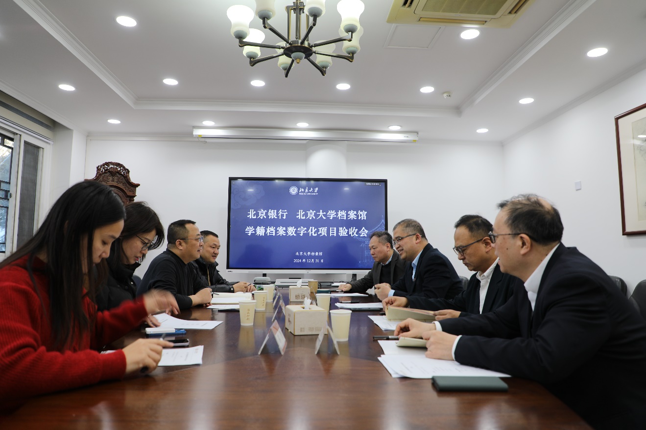 2025年12月31日上午,北京大學(xué)學(xué)籍檔案數(shù)字化項(xiàng)目驗(yàn)收會(huì)在檔案館二層會(huì)議室舉行。北京銀行中關(guān)村分行高等院校事業(yè)部副總經(jīng)理丁宏毅,財(cái)務(wù)部綜合辦主任蔣鍇,檔案館校史館館長(zhǎng)余浚、副館長(zhǎng)賈永剛、技術(shù)編研辦主任郭鵬,項(xiàng)目公司總經(jīng)理韓建強(qiáng)、副總經(jīng)理?xiàng)钅舷、?xiàng)目經(jīng)理張彥樂等出席驗(yàn)收會(huì)。