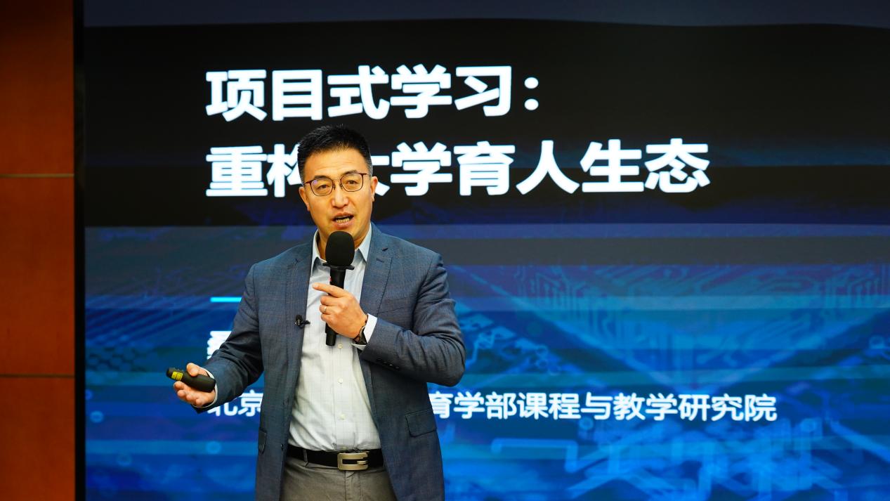 桑國(guó)元在以“基于項(xiàng)目式學(xué)習(xí)的課程與教學(xué)變革”為題的主題報(bào)告中提出,新時(shí)代黨和國(guó)家對(duì)人才培養(yǎng)提出新要求,而傳統(tǒng)大學(xué)課堂面臨著知識(shí)與實(shí)踐、教學(xué)與動(dòng)機(jī)、評(píng)價(jià)與能力“三重脫節(jié)”的現(xiàn)實(shí)之困。“教”和“學(xué)”需要被重新定義,項(xiàng)目式學(xué)習(xí)(Project-Based Learning, PBL)能在高校人才培養(yǎng)過(guò)程中發(fā)揮重要作用。他介紹了項(xiàng)目式學(xué)習(xí)的內(nèi)核與價(jià)值,強(qiáng)調(diào)高質(zhì)量PBL具有知識(shí)度、真實(shí)度、實(shí)踐度、協(xié)作度、參與度和感知度這“六度”特征。他結(jié)合案例介紹了PBL在大學(xué)落地的路徑與策略,并與參會(huì)教師進(jìn)行互動(dòng)。