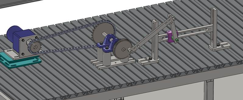 1、按照要求搭接好電機(jī)和一級齒輪減速器,減速器的高速軸作為輸出軸,其上安裝曲柄。