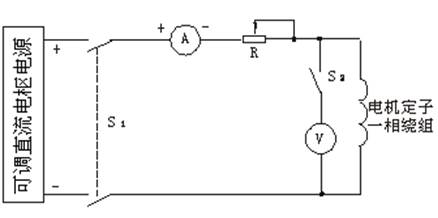 按圖3-1接線。把R調(diào)至最大位置,合上開關(guān)S1,調(diào)節(jié)直流電源輸出電壓及R阻值使試驗電流不超過電機額定電流的20%,以防因試驗電流過大而引起繞組的溫度上升,讀取電流值,再接通開關(guān)S2讀取電壓值。讀完后,先斷開開關(guān)S2,再斷開開關(guān)S1。