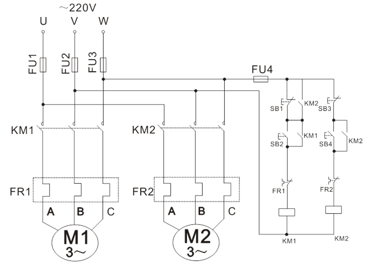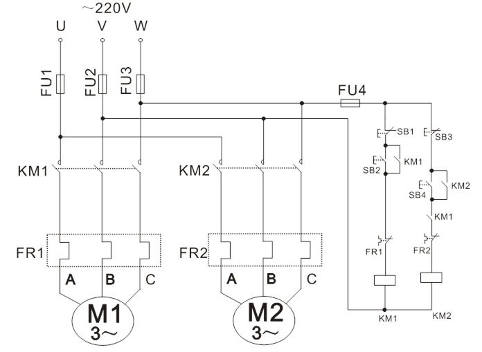 (4)在M1與M2都運行時,單獨按下SB1,觀察并記錄電機及接觸器運行狀態(tài)。