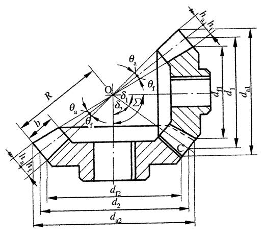 圓柱齒輪中的各有關(guān)圓柱參數(shù),對(duì)于錐齒輪都變?yōu)閳A錐參數(shù)了。錐齒輪的兩個(gè)端面的尺寸不同,因此將其分為大端參數(shù)和小端參數(shù),為了計(jì)算和測(cè)量方便,通常取錐齒輪大端的參數(shù)為標(biāo)準(zhǔn)值,即大端分度圓壓力角a=20°,大端模數(shù)為標(biāo)準(zhǔn)模數(shù)。直齒錐齒輪在設(shè)計(jì)、制造和安裝方面都比較簡(jiǎn)單,應(yīng)用廣泛。