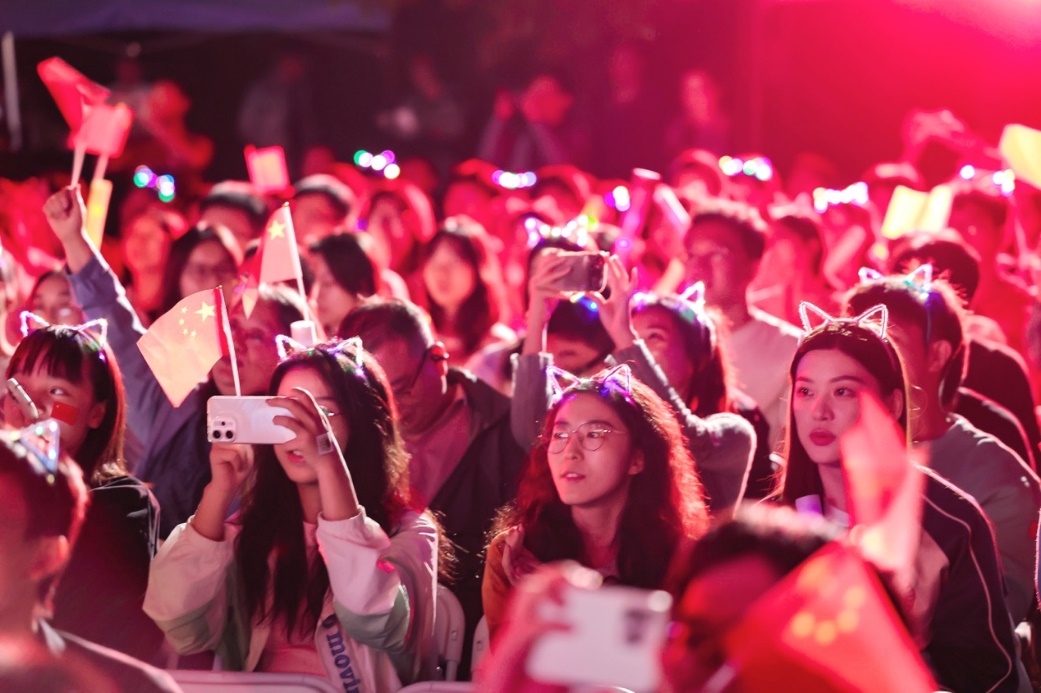 十佳歌手聯(lián)袂獻唱的《我愛你中國》向祖國送出最深情的告白,用歌聲獻禮祖國華誕。大屏幕上一幅幅中國壯麗風光、建設成就和人民幸福生活的影像徐徐展開,與歌聲交織成一曲動人的視聽交響。 “我愛你中國,心愛的母親”唱響時,全場觀眾深受感染,情不自禁地起身揮動手中的國旗,一同加入合唱。霎時間,草坪化為一片涌動的紅色海洋,激昂的歌聲與澎湃的激情交織,將晚會現(xiàn)場化作一堂生動而深刻的愛國主義課堂。