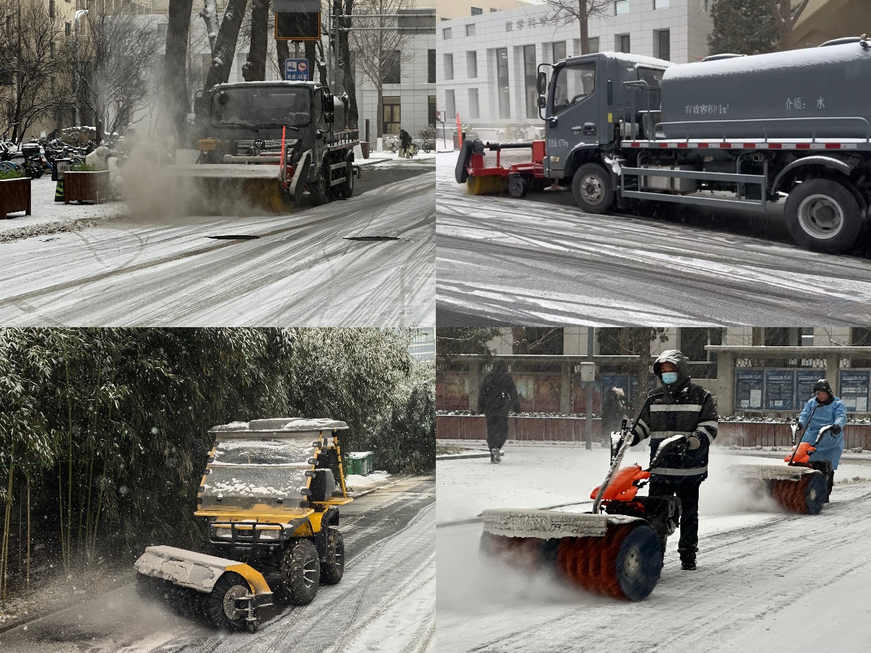 校園服務中心在總結以往經(jīng)驗的基礎上,進一步優(yōu)化掃雪鏟冰應急預案。接到天氣預警后,中心召開專項會議,逐級壓實責任,配備一支應急保障隊伍,一線備勤約80人,調(diào)試保養(yǎng)好專業(yè)掃雪車、機械設備和手持工具,為應對雪情做好充分準備。