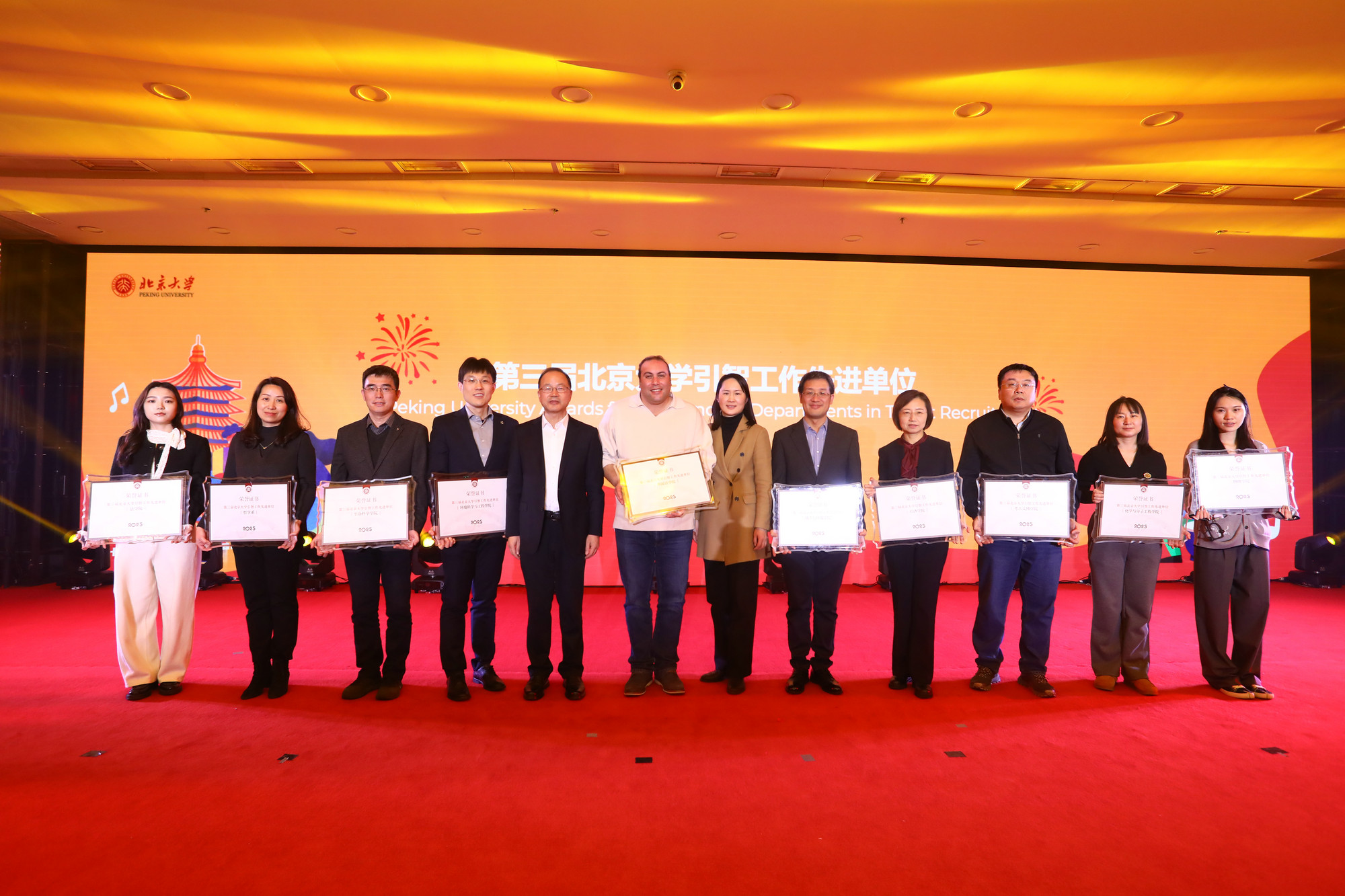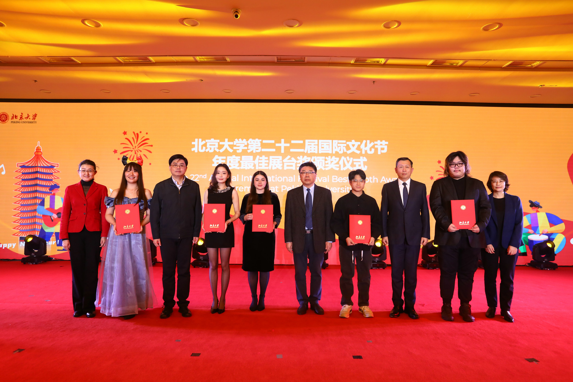 與會(huì)領(lǐng)導(dǎo)和嘉賓為“第三屆北京大學(xué)引智工作先進(jìn)單位和先進(jìn)個(gè)人”獲得者頒獎(jiǎng),為獲得“北京大學(xué)第二十二屆國(guó)際文化節(jié)年度最佳展臺(tái)”的5個(gè)國(guó)家展臺(tái)所屬留學(xué)生代表頒獎(jiǎng)。