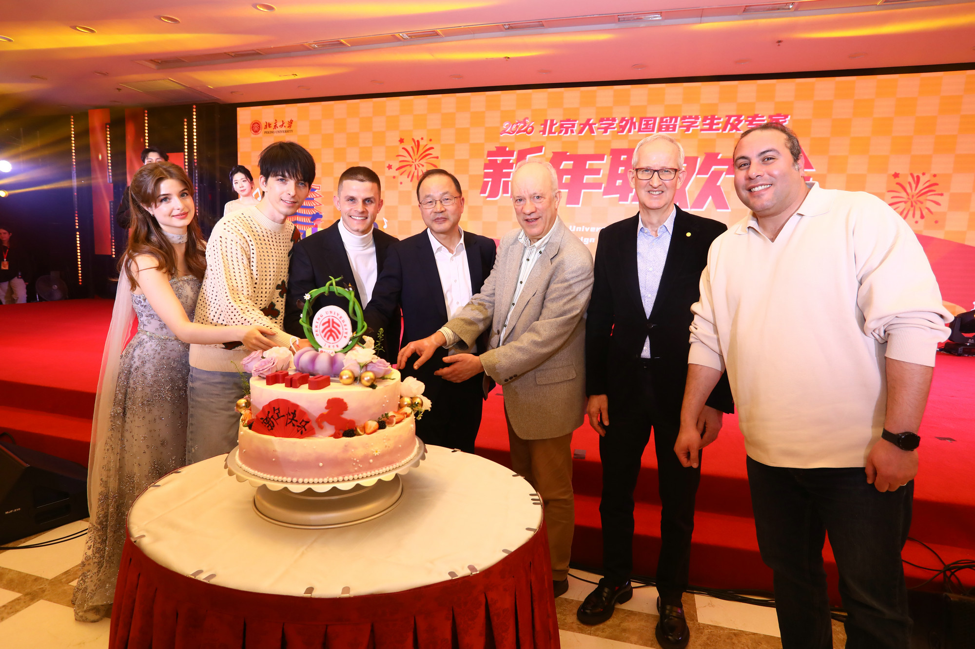 在喜慶祥和的氛圍中,何光彩與牛津大學(xué)榮休教授、北京大學(xué)客座講席教授羅伯特·恰德(Robert L. Chard),全球健康發(fā)展研究院教授施賀德(Bernhard F. Schwartländer),外國(guó)語學(xué)院助理教授高山(Alaa Mamdouh Akef),2021屆意大利籍工學(xué)院碩士研究生安德里亞(Andrea Dal Mas),2022級(jí)俄羅斯籍國(guó)際關(guān)系學(xué)院博士研究生羅維衛(wèi)(David Kolosov),以及2025級(jí)匈牙利籍元培學(xué)院本科生多麗娜(Dorina Inges)共同分享寓意團(tuán)圓與希望的新年蛋糕,讓跨越國(guó)界的友誼與祝福在甜蜜的燕園滋味中升華。