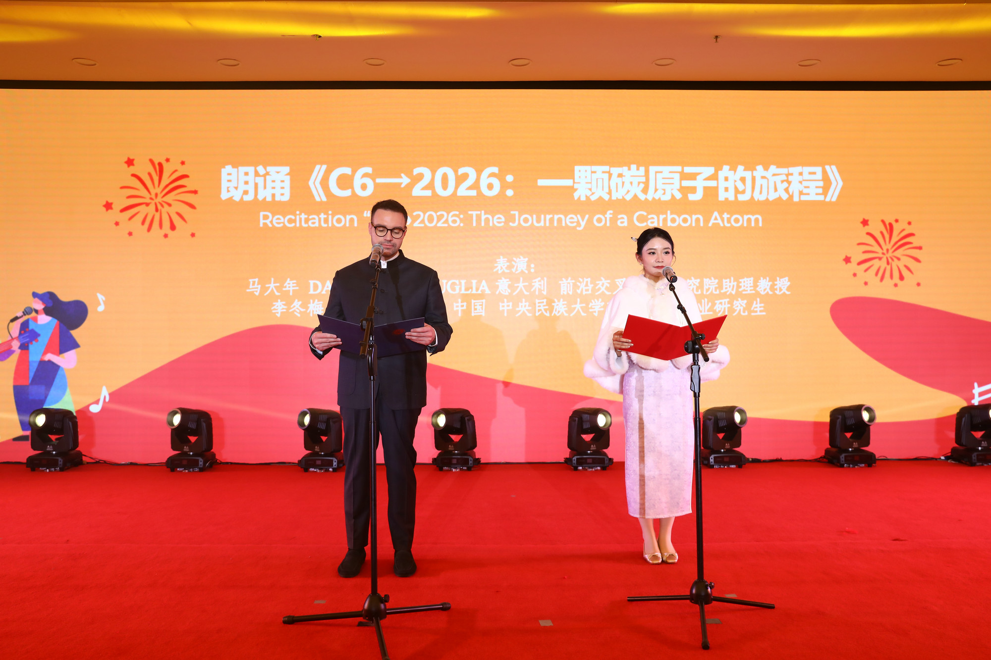 來自意大利的前沿交叉學(xué)科研究院助理教授馬大年(Daniele Macuglia)與來自中國(guó)的李冬梅同學(xué)帶來朗誦《C6→2026:一顆碳原子的旅程》