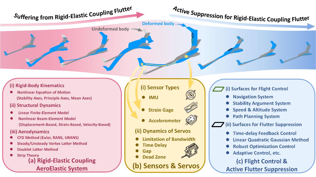 2025-12-26 08:13飛翼布局飛行器是新一代戰(zhàn)略轟炸機、高空無人偵察機首選的氣動布局。然而,這類飛行器的機翼彎曲頻率低,導(dǎo)致其剛體短周期俯仰模態(tài)與機翼低階彈性模態(tài)在氣流作用下相互耦合,誘發(fā)剛-彈耦合顫振,嚴重限制飛行器的飛行包線和任務(wù)執(zhí)行能力。如何突破剛-彈耦合顫振屏障已成為新一代飛翼布局飛行器研制亟待解決的核心難題。