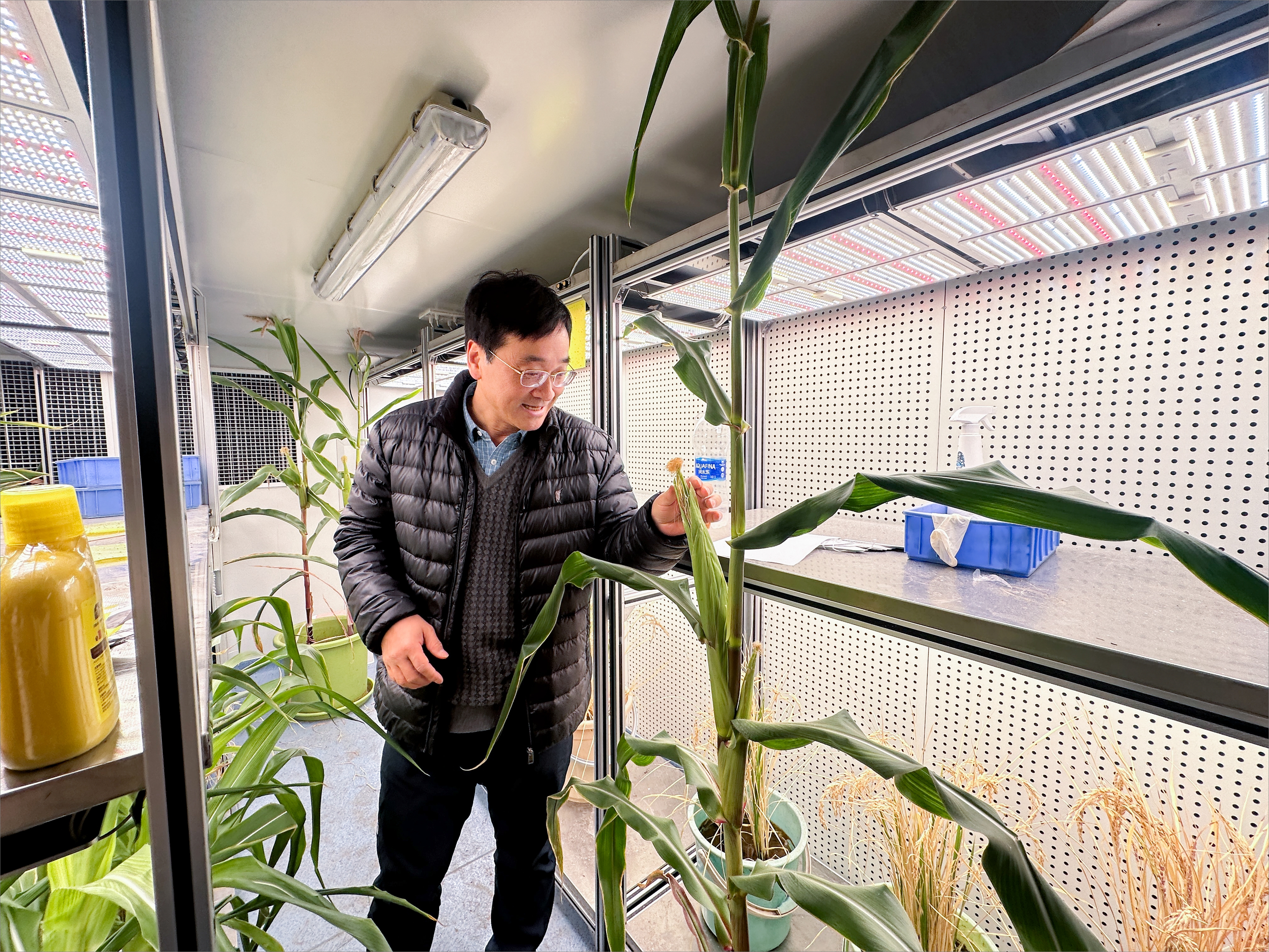 瞿禮嘉在實(shí)驗(yàn)室察看實(shí)驗(yàn)植物生長情況