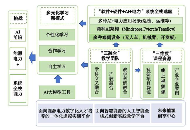 為破解人工智能快速發(fā)展背景下,面向“AI+能源電力”數(shù)智化應(yīng)用型人才培養(yǎng)的人工智能實踐課程教學(xué)的三個難題:一是課程教學(xué)如何體現(xiàn)能源電力特色,以支撐能源電力數(shù)智化人才培養(yǎng);二是課程內(nèi)容如何與人工智能前沿技術(shù)發(fā)展銜接;三是如何解決學(xué)生只懂軟件開發(fā),不懂硬件應(yīng)用,不具備計算機系統(tǒng)全棧思維,不了解計算機在實際生產(chǎn)中的實際應(yīng)用。人工智能課程組按照工程教育OBE的教學(xué)理念,在教學(xué)實踐中堅持“以學(xué)生發(fā)展為中心,緊貼技術(shù)發(fā)展前沿,服務(wù)能源電力行業(yè)”的理念,基于學(xué)校建設(shè)的三個高水平實驗平臺,創(chuàng)新地設(shè)計了“三融合”教學(xué)團隊(跨學(xué)科交叉融合、產(chǎn)教融合、教學(xué)科研融合)、“三維度”教學(xué)資源庫(線上視頻課資源、科研項目資源、行業(yè)企業(yè)案例資源),以及與AI輔助編程工具快速發(fā)展背景相適應(yīng)的具備“軟硬全棧、個性化學(xué)習(xí)、合作學(xué)習(xí)”特色的創(chuàng)新教學(xué)模式。