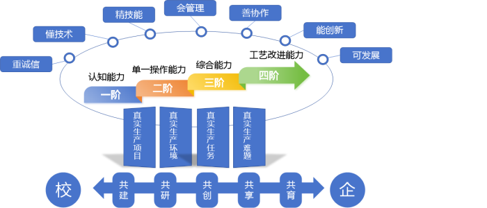 創(chuàng)新性引入生產(chǎn)一線“四真”要素(真實(shí)生產(chǎn)項(xiàng)目、環(huán)境、任務(wù)、難題),驅(qū)動(dòng)學(xué)生能力實(shí)現(xiàn)“四階”漸進(jìn)式躍升:認(rèn)知能力→單一操作能力→綜合能力→工藝改進(jìn)與創(chuàng)新能力。該模式顯著提升了學(xué)生的核心職業(yè)能力和崗位適應(yīng)性,實(shí)現(xiàn)了校園到崗位的無(wú)縫銜接。