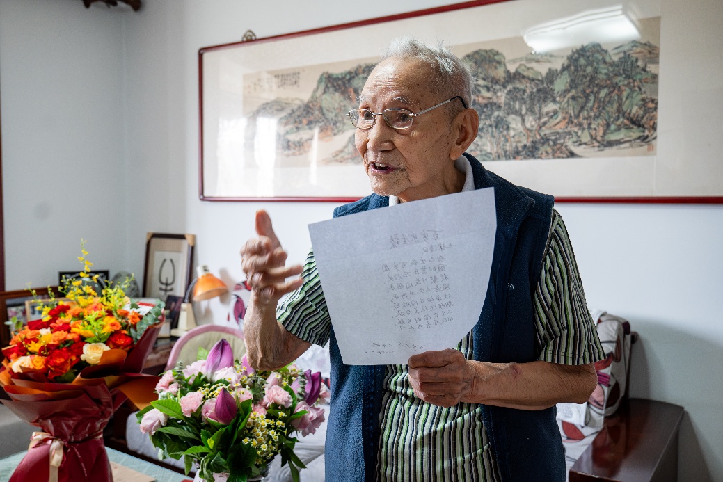 這位精神矍鑠的期頤老人,至今仍堅(jiān)持獨(dú)居自理。每當(dāng)吟誦起自己創(chuàng)作的詩(shī)篇,讀至情動(dòng)處,他那洪亮的聲音總能讓人不自覺(jué)感染熱忱的力量。