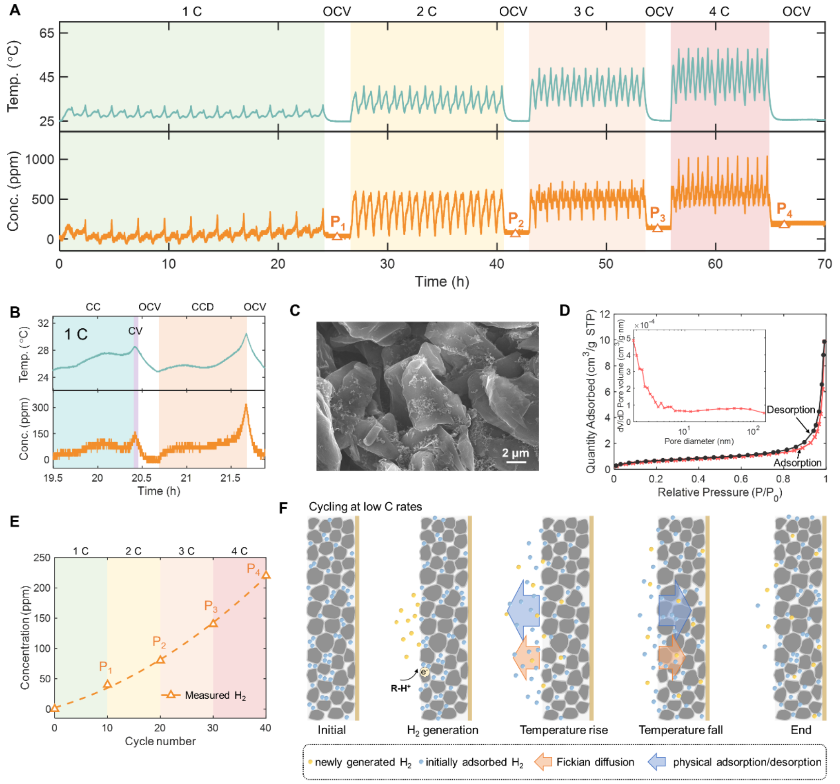 該研究首次揭示了電池內(nèi)部與溫度相關(guān)的可逆性H2演化行為(圖2):在1C倍率下H2濃度可達(dá)380 ppm,在4C倍率下則升高至1040 ppm;而在長期循環(huán)后,還觀察到不可逆的H₂生成,濃度最高可達(dá)220 ppm。可逆性H2的演化主要?dú)w因于多孔石墨負(fù)極材料對氣體的吸附-脫附作用。值得注意的是,研究首次在實(shí)驗(yàn)中發(fā)現(xiàn)了電池循環(huán)過程中氫氣演化的NTC(負(fù)溫度系數(shù))行為(圖3):在某些高升溫速率下的特定溫度區(qū)間內(nèi),H2濃度與內(nèi)部溫度呈反向變化趨勢。這一現(xiàn)象被認(rèn)為與溫度誘導(dǎo)的擴(kuò)散行為密切相關(guān)。