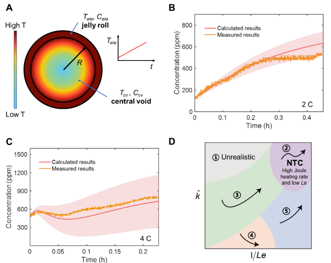 為此,進(jìn)一步建立了一個(gè)描述電池內(nèi)部氫氣瞬態(tài)與空間演化的理論模型,涵蓋吸附/脫附、Fick擴(kuò)散、Soret擴(kuò)散及化學(xué)反應(yīng)等多種機(jī)制,系統(tǒng)解釋了該NTC行為,認(rèn)為其源于在高焦耳熱效應(yīng)與電池系統(tǒng)低Lewis數(shù)條件下,H2的Soret擴(kuò)散增強(qiáng)所致(圖4)。