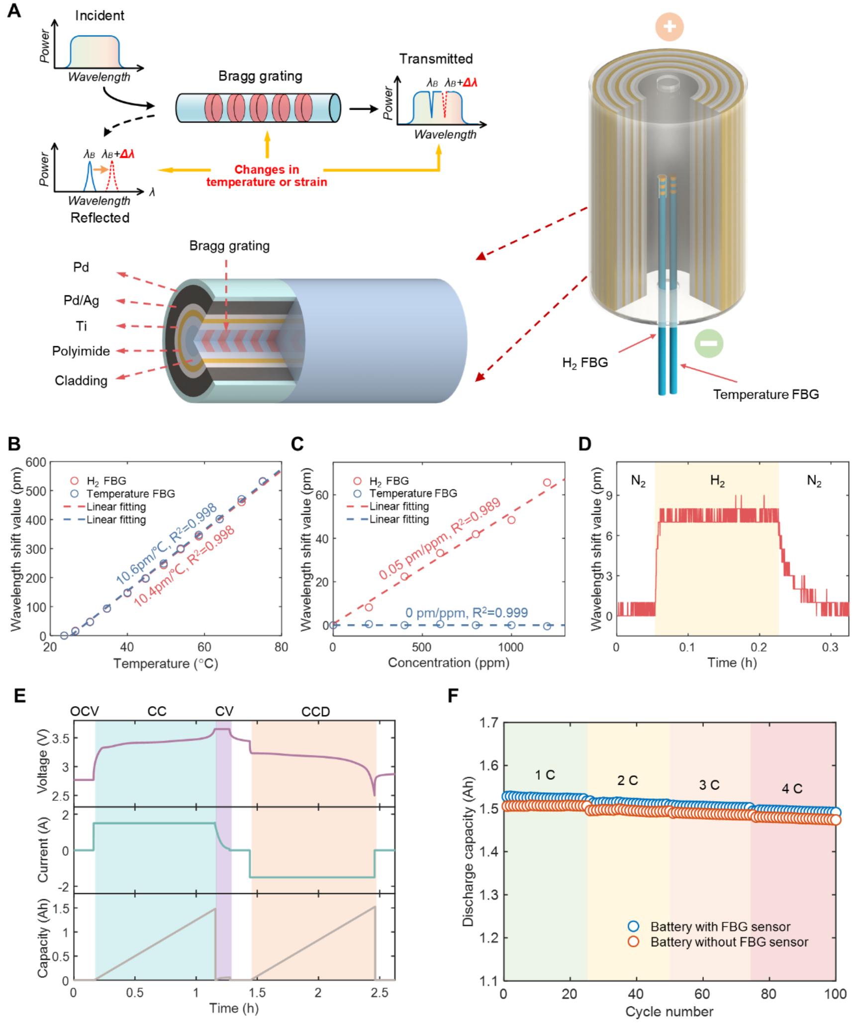研究團(tuán)隊(duì)基于近年來智能電池領(lǐng)域發(fā)展的新型光纖傳感技術(shù)(圖1),設(shè)計(jì)了適用于電池內(nèi)部非破壞性氫氣檢測的光纖布拉格光柵(FBG)傳感器,可在商用18650電池的充放電過程中實(shí)時(shí)定量監(jiān)測氫氣演化行為。該光纖檢測方法具備多項(xiàng)優(yōu)勢,包括:無需取樣、優(yōu)異的時(shí)間分辨率(約15秒)、高靈敏度(最小檢測限約為10 ppm),且不會干擾鋰電池內(nèi)部的反應(yīng)過程。該方法能夠在工業(yè)級鋰離子電池中實(shí)現(xiàn)對H2演化過程的精準(zhǔn)有效監(jiān)測,為鋰電池?zé)崾Э貦C(jī)制的研究及其安全預(yù)警體系的建立提供關(guān)鍵技術(shù)支撐。
